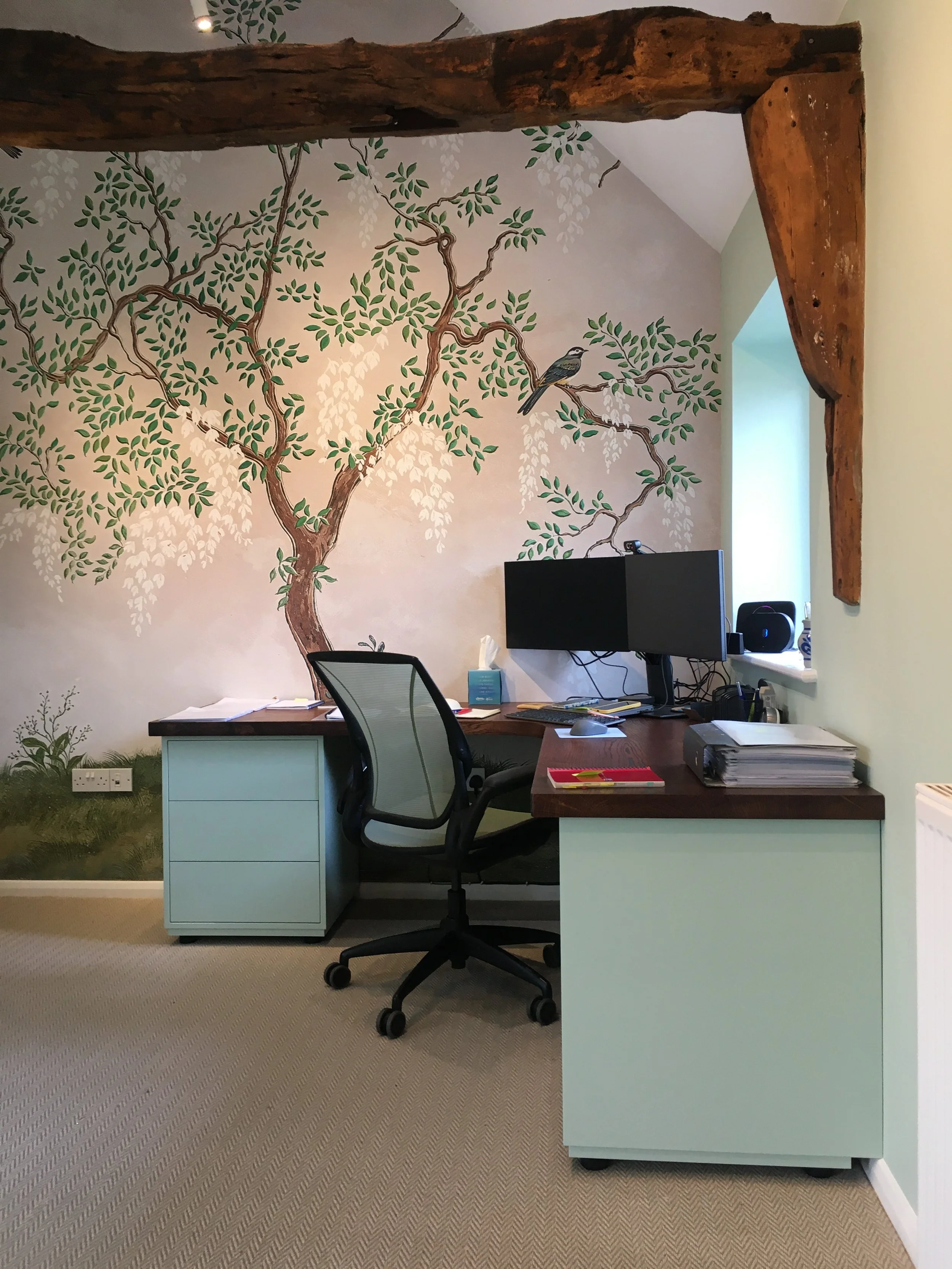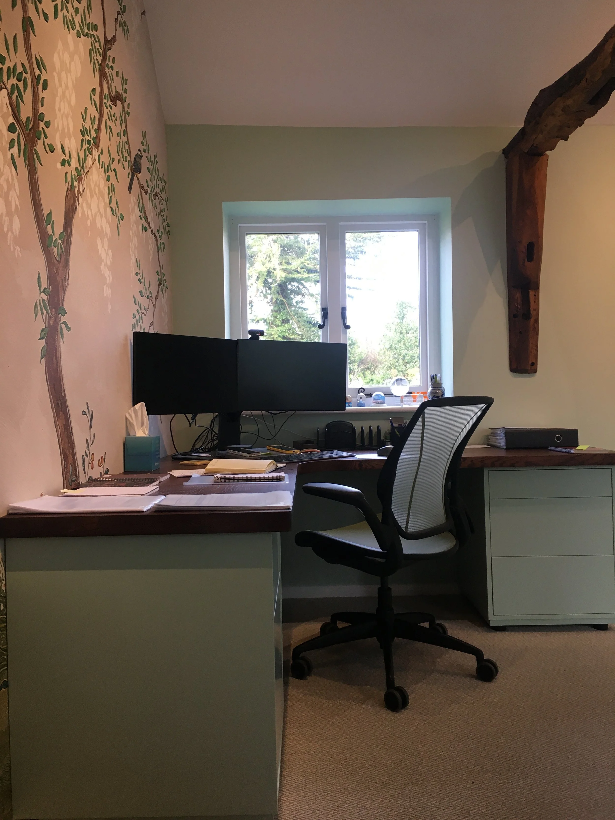Below the desktop we fitted twin plinth units, each with a bank of drawers to house the essentials for homeworking: files, stationary, notebooks and pens. The units were spray finished throughout in Dulux Willow Tree to perfectly co-ordinate with the room decoration. The drawers were fitted with pressure latches (tap to open) to avoid the need for handles and so maintain a clean, minimal aesthetic.