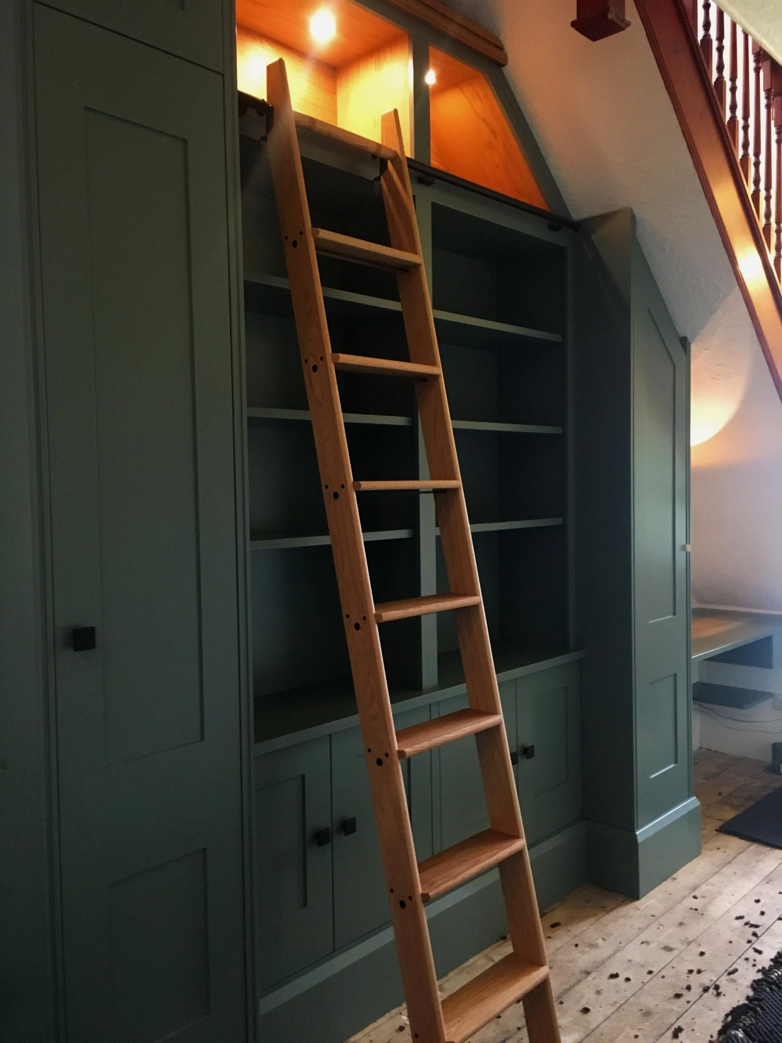 A companion piece to the reading nook, above. Traditional construction, shaker style panel doors; solid red oak ladder; integrated lighting inside oak-lined display boxes; and a solid oak cornice above. The desk at the end, in the spandrel (the space under the stairs) was topped in black leather with a delicate gold inlayed border, and we suspended a pen drawer underneath it (we hadn’t done this yet when the photo was taken). The enclosed desk area in is lit by another wall lamp to twin with the one in the reading nook.