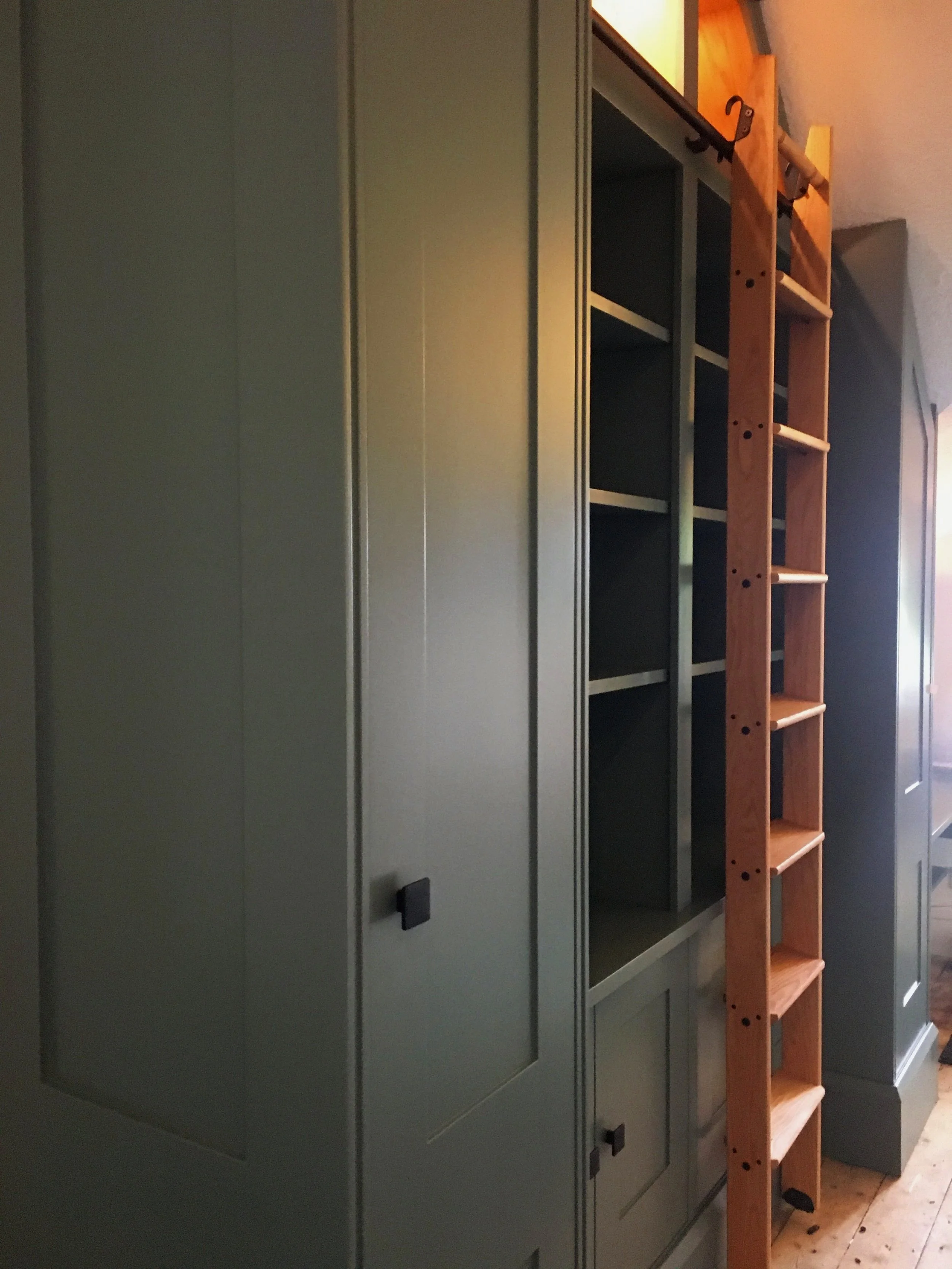 An open-faced, oak-lined display cabinet above, fitted with integrated, dimmable LED lamps – a place to display personal items, vases, etc., and to store more books. The display cabinet is accessed using a detachable library ladder. Super-deep drawers below offer further storage. Spray finished throughout in Ambleside, a beautiful shade of green-grey.