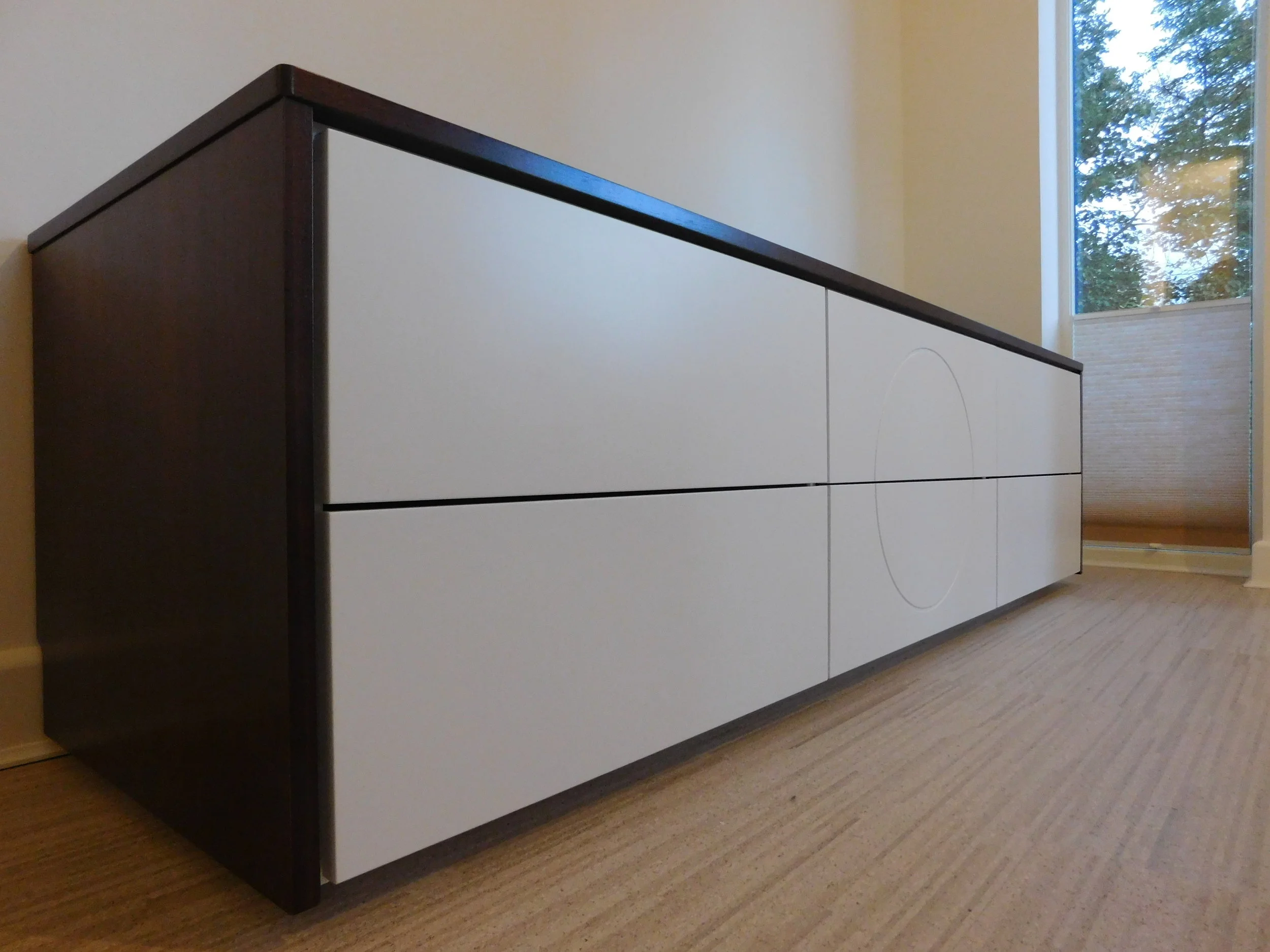 Mahogany stained walnut with white sprayed drawer fronts on Touch-to-open runners.
